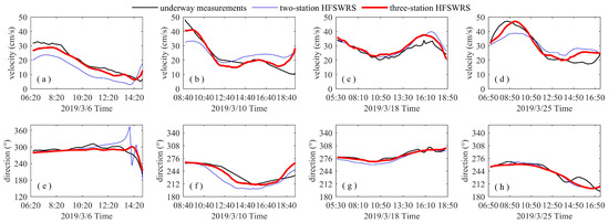 (a–d) Sea surface current velocity and (e–h) direction observed by the underway measurements (black lines), the two-station HFSWRS (blue lines), and three-station HFSWRS (red lines) in the spring of 2019.