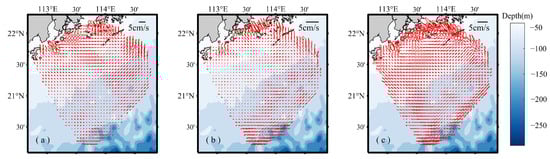 Based on the tidal-level data at Dawanshan Station, the tidal range reaches its minimum on 12 March, which is chosen as the representative day for the neap tide. Meanwhile, the tidal range reaches its maximum on 20 March, which is chosen as the representative day for spring tide. Daily averaged sea surface currents are shown in Figure 6. On the representative day for the spring tides, the current direction at observation points near the northwest coast is perpendicular to the coastline. Due to the blocking effect of the coastline and islands, local sea surface currents flow southwest along the coastline. The southwest and central regions of the study area show northward flow, while sea surface currents in the northeast are influenced by the environment and flow southward. On the representative day for the neap tides, the sea surface current direction in the observed area is generally from east to west, with significantly increased current velocity near the coast.