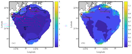 The tidal type , where , , are the semi-major axes of tidal current ellipse of O1, K1, M2, correspondingly, is calculated. In addition, the shallow water constituent coefficient is calculated, where and are the semi-major axes of the tidal current ellipse of M4 and MS4, respectively. Figure 5 provides the spatial representations of tidal current patterns and the impact of shallow water constituents within the adjacent waters of the Pearl River Estuary.