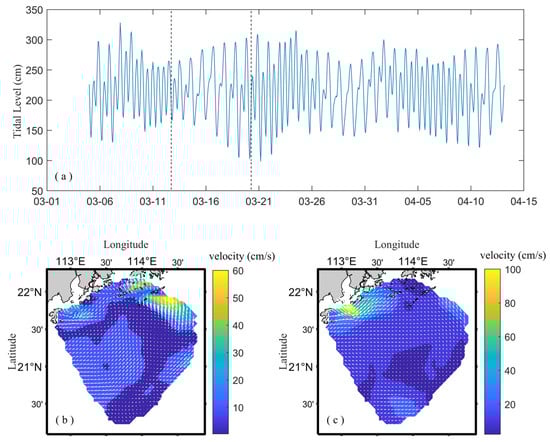 (a) Time series of the tidal level at Dawanshan Station, and spatial distribution of the daily averaged sea surface current during (b) the spring tide (20 March 2019) and (c) the neap tide (13 March 2019).
