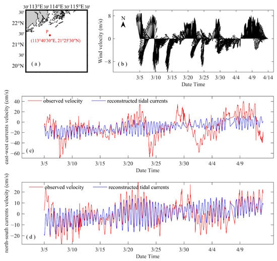 (a) Position of point P, (b) wind data at point P, (c) east-west current velocity from the observations (red line) and the reconstructed tidal components (blue line), and (d) same as (c) but for north–south current velocity.