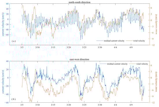 As the residual currents significantly contribute to the dispersion and diffusion of suspended and soluble matter in the ocean, the residual currents are calculated by subtracting the periodic tidal currents from the observed current and are studied. The periodic tidal currents are reconstructed by substituting the harmonic constants of the tidal constituents obtained in harmonic analysis into the right side of Equation (1). As shown in Figure 8c,d, there are differences between the observed velocity data and the reconstructed tidal currents at point P, especially in the east–west direction, indicating that the residual current in the east–west direction is prominent. The wind velocity at point P was obtained from Copernicus Climate Change Service (C3S) Climate Data Store (CDS) [43] and is shown in Figure 8b. The reconstructed tidal currents of the north–south component align well with the observed velocity. The calculated correlation coefficient for residual current velocity and wind velocity remains at 0.35, indicating a discernible positive correlation between them, as depicted in Figure 9a. In the east–west direction (Figure 9b), the residual current is strongly correlated with the wind. The correlation coefficient between the residual currents and wind is 0.63, indicating that residual currents and wind are highly correlated. The direction of the residual currents is basically consistent with the wind direction. In addition, the variations in residual current velocity and wind velocity are also consistent, demonstrating that the residual current in the observed area is mainly affected by the wind.