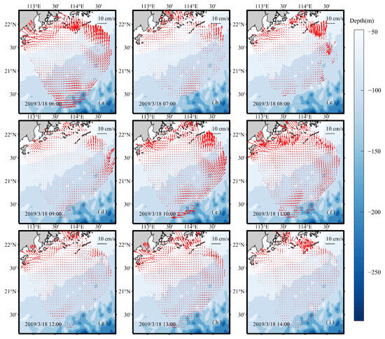 Spatial distribution of tidal residual currents at (a) 6:00, (b) 7:00, (c) 8:00, (d) 9:00, (e) 10:00, (f) 11:00, (g) 12:00, (h) 13:00, and (i) 14:00 on 18 March 2019.