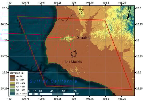 Land surface elevation over Los Mochis, []. The red border corresponds to the special simulation domain, which has a size of 50 × 50 cells.
