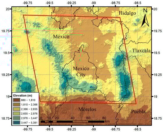 Land surface elevation over the study area called Mexico City (however, it also takes part of nearby territories []). The red border corresponds to the special simulation domain, which has a size of 50 × 50 cells.