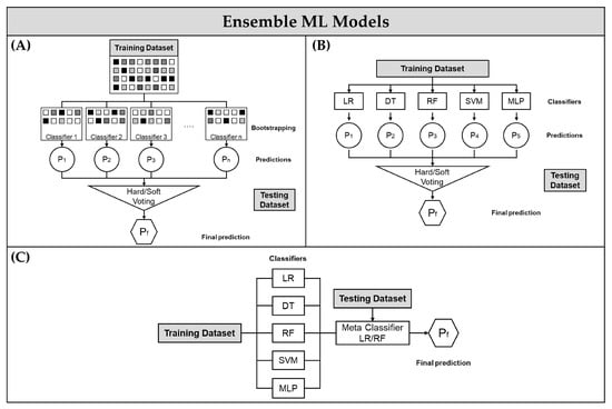 Diagram of ensemble ML methods. (A) Bagging, (B) Voting, (C) Stacking.