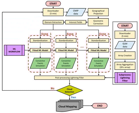 The workflow runs cyclically and automatically every 5 min, corresponding to the temporal resolution of the ABI bands, and it begins with the download of ABI and GLM information from Amazon Web Service (AWS) S3 Storage (https://registry.opendata.aws/noaa-goes/, accessed on 5 December 2023) using Boto3, the AWS Software Development Kit (SDK) for Python. Concerning scalability, this novel methodology contemplates spatial extrapolation to the entire country of Mexico, following the principles of open access and automation, due to the availability of modeling inputs within the entire territory. However, for the training and testing phase of the ML models, zones with a homogeneous convective behavior must be delimited.