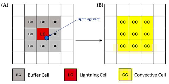 where Ce is the cell center of the Interest Field spatial domain and LI is the coordinate where the Lightning Event was registered. In addition, a 3 × 3 cell buffer was designated around the CC cell identified from the lightning filter (Figure 5).