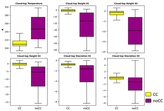 The distribution of Interest Fields selected after feature importance analysis for Los Mochis and Mexico City are shown in Figure 6 and Figure 7, respectively. CC and noCC sets are statistically differentiable in the six selected Interest Fields (which improves the classification task in the ML models) for the Los Mochis area. For the CC class, there are extremely small Inter Interquartile Ranges (IQRs) with a median close to 0 in the case of the spectral difference fields, and in that sense, ref. [] claims that as a cloud reaches its local equilibrium level or the height of the tropopause, all channel differences will be almost zero. On the other hand, with the noCC class, the data distribution is much broader. In the case of the cloud-top temperature (CtT) field, the cells present higher values because the tops of the deep convection clouds are colder due to adiabatic cooling. In the case of the spectral difference fields, these mostly present negative values.