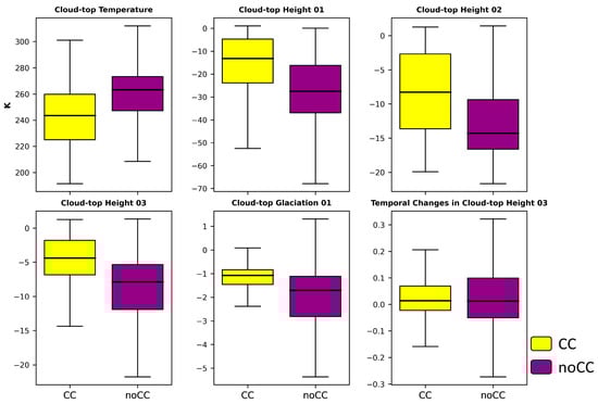 Box plots of input variables generated based on the reference data used for CC detection models, for Los Mochis. The predictor dataset was reduced from 12 input variables to 6 after analyzing the features in the LR and RF models. The number of classes labeled as CC is 24,116 and noCC is 10,884.