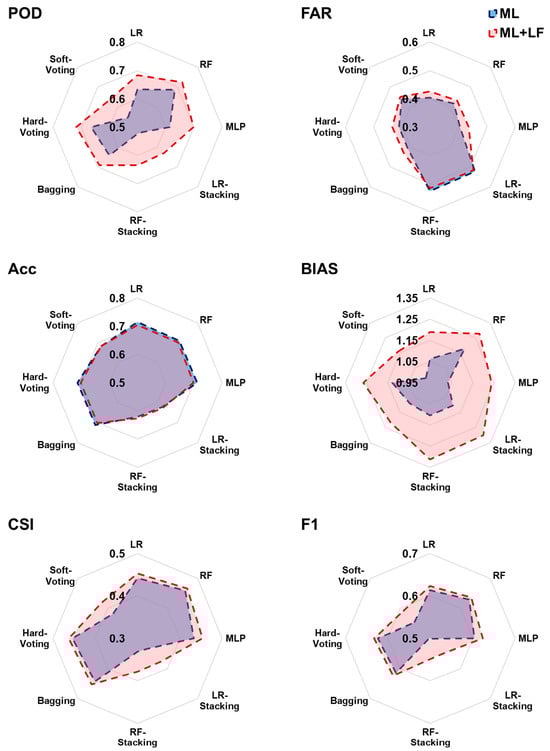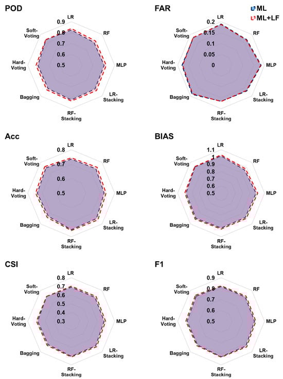The voting method refers to an assembly strategy used to make predictions by integrating the collective predictions of multiple models or classifiers that are trained independently and in parallel on the same dataset. This technique aggregates the prediction of each classifier (here LR, DT, RF, SVM, and MLP; Figure 3b) and predicts the class that receives the most votes. This majority-vote classifier is called a hard voting classifier (Hvoting), otherwise, it is a soft-voting classifier (Svoting), where the class with the highest averaged class probability is selected as the final prediction []. Voting mitigates the impact of individual model biases and errors, leading to improved overall accuracy and robustness. For instance, the work of [] found that majority voting effectively removed salt-and-pepper noise in its results for Convective Initiating objects predicted with DT and RF.