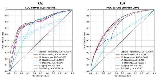 Also known as stacked generalization or stacked ensemble, this technique is used to combine predictions from multiple models to improve overall performance []. In this assembly strategy, the aggregate models called base models (LR, DT, RF, SVM, and MLP; Figure 3c) are used according to their weights to produce an output that is taken using a Meta-Classifier as the input. Each prediction from the base models becomes a new feature in the Meta-Classifier Dataset. The main purpose of the stacking method is that the Meta-classifier learns to combine the predictions of the base models optimally, leveraging their individual strengths. In this work, LR and RF were used as Meta-Classifiers, because both models reported the best performance metrics individually (LRstacking and RFstacking).
