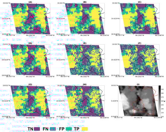 For the construction of the reference dataset, all MODIS images available in the period 2018–2022 were analyzed between the months of greatest precipitation from May to September, for the two spatial domains of interest, Los Mochis and Mexico City. The MODIS images were cut according to the special domain of the study areas, and only sections with a percentage greater than 30% of labeled CC were selected to build the Target Label Dataset to avoid training the ML models with unbalanced class distribution data.