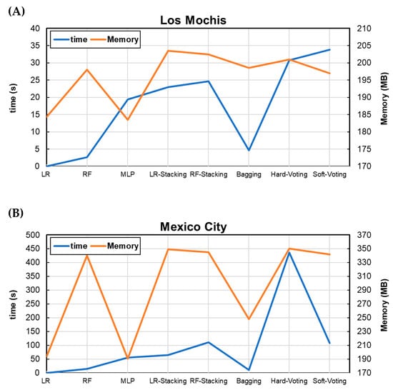 In this study, two Bagging approaches were implemented, RF, and a Bagging method that used LR as the predictor in the bootstrap samples instead of DT (henceforth referred to as Bagging; Table 3 and Figure 3). The number of subsets of the training data corresponding to the number of estimators for RF was determined using a hyperparameter analysis for Los Mochis and Mexico City datasets. In the case of Bagging, the default number of estimators (represented with the parameter n_estimators) in the scikit-learn library was set to 10.