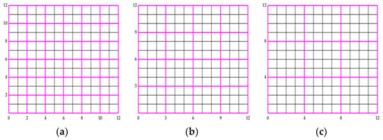 Region division of the single component at different sampling factors (n): (a) 6 × 6 regions at n = 2; (b) 4 × 4 regions at n = 3; (c) 3 × 3 regions at n = 4.