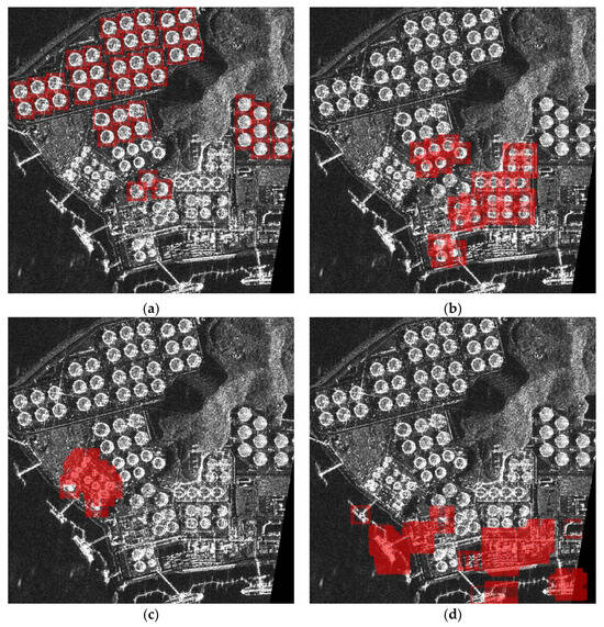 The detection result of four areas in Zhoushan data: (a) data edge oil tank area; (b) fixed-roof oil tank area; (c) densely packed oil tank area; (d) near port oil tank area.