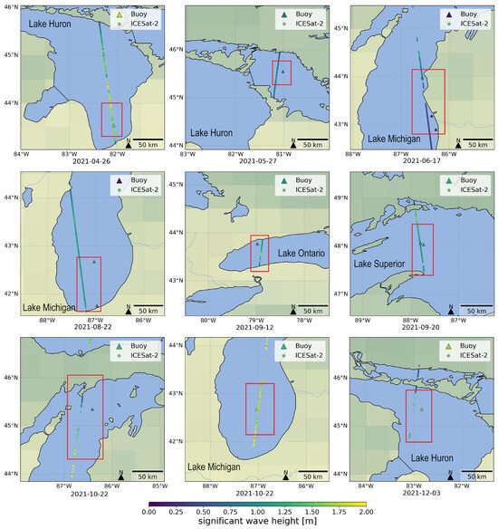 The SWH data from the ICESat-2 ATL13 product are first verified using the in situ buoy observations. Most of the regular real-time buoy datasets are available from the National Data Buoy Center and the Seagull platform of the Great Lakes Observing System. These regular buoy measurements are limited to non-winter seasons because buoys are retrieved in the late fall to avoid damage from ice cover. Recently, drifting wave buoys were experimentally deployed in the Great Lakes over the winter. These drifting wave buoys, called Spotter buoys, are low-cost, solar powered metocean buoys developed by Sofar Ocean Technologies, Inc., San Francisco, CA, USA [17]. Spotter buoys have been used in studies understanding wave conditions in the marginal ice zone of the Arctic Ocean [18] and other coastal oceans [19]. For the verification work, we utilized the regular buoy data for late summer–fall when high wind conditions are secondly frequent following winter [20] and therefore SWH tends to be higher. The distribution of the regular buoys is shown in Figure 1. Their basic information including buoy ID, coordinates, sampling time interval, water depth, number of observed samples used in the study, lake, and data source (NDBC or Seagull) is listed in Table A1. For the wintertime verification, we utilized the Spotter buoy data from the experimental deployment during 10–18 February 2022 in Lake Michigan. The trajectory of the drifting Spotter buoy is shown in the corner of Figure 1.