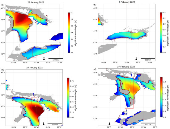 The GLWUv2 significant wave height retrospective forecast in comparison with ICESat-2 significant wave height measurements for two low wave scenarios (a) Lake Huron and Lake Erie on 22 January 2022, (b) Lake Ontario on 1 February 2022, and two high wave scenarios (c) Lake Huron on 23 January 2022, (d) Lake Huron on 27 February 2022. Dark red (invalid values) at the edge of the gray area (ice coverage) has no meaning and was removed from the comparison.