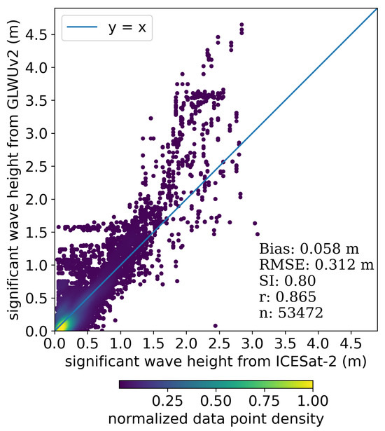 The significant wave height comparisons between GLWUv2’s retrospective predictions and ICESat-2 measurements in winter (January and February 2022). The color gradient indicates that most of the data points gather at low wave height.