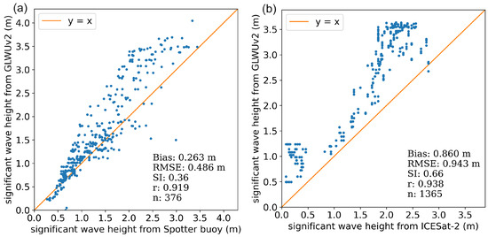 Similarly, the same comparative approach was extended to examine GLWUv2’s SWH retrospective forecast results. This assessment involved comparisons of GLWUv2 SWH outputs with both ICESat-2 SWH measurements and drifting Spotter buoy observations. In each matched data pair, the GLWUv2 data point was also rigorously selected as the closest counterpart. Consequently, a total of 53,472 matched data pairs were obtained from the matching with ICESat-2 SWH measurements during the period of 1 January to 28 February 2022, and the matching with the Spotter buoy observations yielded 376 matched data pairs during the period of 10–18 February 2022.