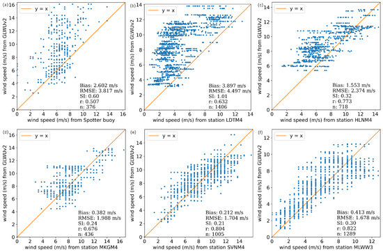 Having served as the exclusive buoy data source for winter wave conditions, the solitary Spotter buoy, deployed experimentally in Lake Michigan from 10 to 18 February 2022, offers a unique opportunity to directly scrutinize GLWUv2’s significant wave height (SWH) predictions. The Spotter buoy’s trajectory during this period is shown in red in Figure 6. A total of 376 valid Spotter buoy records were matched with the GLWUv2 predictions for this period, forming the visual comparison via scatter plots. As indicated in Figure 7a, it remains evident that GLWUv2 leans towards overestimating SWH in instances of higher waves, while aligning well with Spotter buoy observations in cases of lower waves. The calculated RMSE is 0.486 m, and the bias is 0.263 m.