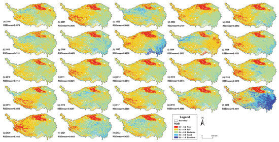 Figure 2 illustrates the annual spatial distribution characteristics of the RSEI computed via the GEE platform from 2000 to 2022. The spatial distribution pattern of the ecological and environmental quality on the Tibetan Plateau displayed a distinct regularity, depicting a decreasing trend from southeast to northwest. The average RSEI value for the Tibetan Plateau during the period 2000–2022 reached 0.404. The RSEI values were classified into five categories, where higher values indicated greater vegetation coverage, a healthier ecological environmental, and a more stable ecosystem, while lower values suggested adverse regional conditions [51].