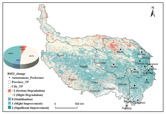 The spatial distribution of the RSEI change trend in the Tibetan Plateau from 2000 to 2022.