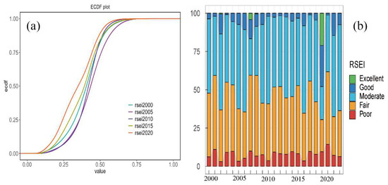 To further examine the five-year variation characteristics of RSEI on the Tibetan Plateau using the Empirical Cumulative Distribution Function (ECDF) in MATLAB software, fluctuations were observed (Figure 4a). In comparison to the year 2020, the ECDF values for the remaining years exhibited a notable rightward deviation, with the most significant deviation observed in 2005. This suggested a relatively superior overall ecological environment in 2005 as opposed to 2020, reaching a value of 0.431. The ECDF value for the year 2000 was positioned at a mid-range level. Moreover, in 2010 and 2005, corresponding to lower RSEI values, a similar probability distribution was evident; however, as RSEI gradually improved, distinctions became apparent.