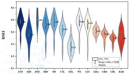 In Figure 5, the highest RSEI median was observed for DNF at 0.499. This observation was primarily attributed to the limited extent of DNF coverage in the Tibetan Plateau. The second-highest RSEI median value was for WS, with a median of 0.485. Meanwhile, ENF and MF exhibited nearly identical RSEI medians, both at 0.484 and 0.483, respectively. These results indicated that the land use types with the most significant contribution to RSEI were WS, ENF, and MF. Subsequent land use categories include SAV, DBF, CSL, and GRA, with RSEI medians of 0.474, 0.465, 0.424, and 0.407, respectively. Notably, GRA displays the most concentrated response values to RSEI, with 0.407, exceeding the medians of CRO at 0.382, EBF at 0.377, UBL at 0.35, and BAR at 0.348. The smallest RSEI median value was observed for OSL, reaching 0.273, indicating that the RSEI of OSL was more vulnerable. Its corresponding maximum RSEI value is only 0.314, classified as Fair.