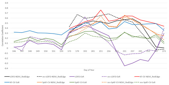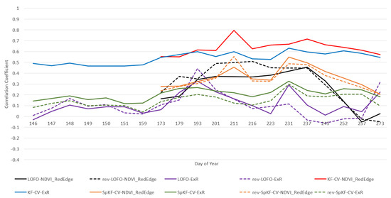 In our previous work [32], the CC was used for ranking. In the present work, we chose the measure because (a) it is more adequate for ranking (larger values represent strictly better performance), and (b) large outliers in the RMSE results existed, likely caused by VI divisions by nearly 0, which skewed the RMSE average results. Furthermore, we chose the LOFO-CV and rev-LOFO-CV experiments to avoid having an over-optimistic performance affect rankings. The LR model was chosen since it was the better-performing model for these experiments. Table 5 illustrates the top five best-ranked VIs for each of the defined stages of the growing season, namely, the early, middle (mid), late, and entire season. These seasons were defined as follows: early = {DoY = 173, DoY = 179}, mid = {DoY = 193, DoY = 201, DoY = 211, DoY = 216, DoY = 223, DoY = 231}, late = {DoY = 237, DoY = 245, DoY = 252, DoY = 257, DoY = 273}, and entire = {early ∪ mid ∪ late}. In terms of growth stages, by observing Table 4, early season includes stages V7 and V8 (V10 is not included, for example, since early season includes up to DoY 179 and does not include DoY 186), mid season includes stages from V11 to R3, and late season includes stages R4 and R5. A source of bias is that the mid season contains more growth stages than the early and late seasons.