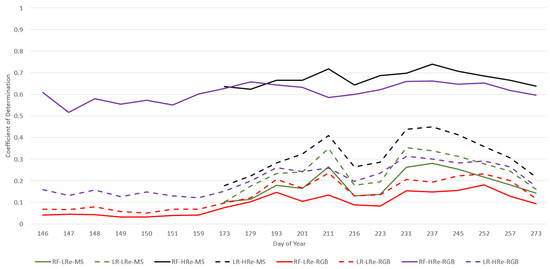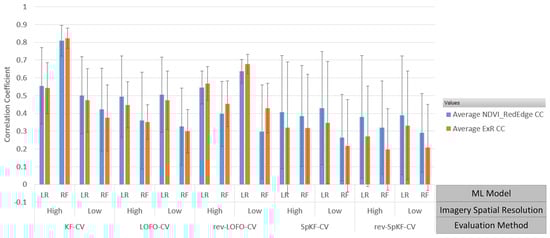 Figure 2 and Figure 3 illustrate the results of an analysis that involved examining average CC performance of RF and LR over the entire growing season to compare the difference between the evaluation method, RGB and MS imagery, and the image acquisition dates. Two VIs were chosen: ExR (an RGB VI that represents RGB imagery) and (an MS VI that represents MS imagery). These VIs were chosen, since we found was one of the better-performing MS VIs and ExR was one of the better-performing RGB VIs in the present work. The results for each DoY were averaged over both types of datasets (HRe and LRe). Focusing less on the effects of image acquisition date, Figure 4 illustrates the effects that image spatial resolution (HRe vs. LRe) and ML model (RF vs. LR) have on yield prediction performance results for a single image acquisition date (DoY 193). Figure 4 also enables the comparison of RGB imagery vs. MS imagery. ExR was chosen as the VI to represent the RGB imagery, since it was one of the better-performing RGB VIs and it did well for DoY 193. Similarly, was one of the better-performing MS VIs, so it was chosen in this analysis. DoY 193 was chosen, since ExR and did similarly well on that day, which enables analysis of the effects of evaluation method, ML model, and imagery spatial resolution on performance. Figure 5 shows the results of performing yield prediction using KF-CV and using only location data as features.