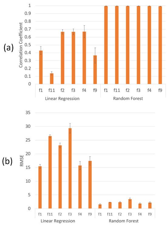 The RMSE describes how much model predictions can be expected to be off by on average, where smaller values indicate better performance. Furthermore, RMSE shares the same units as the target variable [49], pp. 443–444. The values of RMSE lie in the range [68].