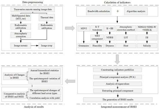 The experimental procedure of the present study is illustrated in Figure 2. The specific steps were as follows: First, preprocessing operations on remote sensing imagery were conducted, which primarily involved the radiometric calibration and atmospheric correction of the raw remote sensing images, followed by the mosaicking and cropping of the corrected images to ensure that the cropped images were well suited to the study area’s boundaries. Second, the five component indices of the IRSEI were computed, and these indices were calculated according to several previous studies [35,36,37,38,39]. Through the dissection of algorithms, the most appropriate expressions were selected, and several algorithmic models were transformed into parameter settings for the computation of remote sensing image bands, resulting in the acquisition of specific values and distribution characteristics of the component indices. Thirdly, the five component indices—greenness, humidity, dryness, heat, and salinity—were standardized and fused, followed by principal component analysis to obtain statistical information for each component. Subsequently, the first principal component post-transformation was utilized as the representative component encapsulating the primary information of the indices; ultimately, mathematical transformations were applied to obtain quantified results of the IRSEI for the farm within the study area. Fourth, an analysis of the results was conducted, which was divided into two parts. The first part involved categorizing and statistically assessing the IRSEI outcomes according to annual quality grades. The second part entailed a comparative analysis of the IRSEI results against the original RSEI outcomes across different land use types, as well as an analysis of the correlation with crop yields. This made it possible to evaluate the advantages of the IRSEI method.
