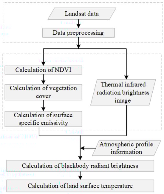This study investigated the use of land surface temperature (LST) as a representation of heat [48]. The thermal infrared bands of the Landsat satellite series are sensitive to the thermal radiation of surface coverings, allowing them to be extensively utilized in monitoring LST variations [49]. Regarding LST computations, there are two conventional methodologies: the single-channel algorithm and the multichannel algorithm. The single-channel algorithm encompasses methods such as atmospheric correction (also referred to as the radiative transfer equation), the universal single-channel method, and the single-window algorithm. The multichannel algorithm primarily includes the split-window algorithm and the temperature emissivity separation algorithm. In this chapter, the atmospheric correction method is adopted for LST inversion. The principle of calculating surface temperature using the atmospheric correction method involves initially aggregating the total thermal radiation detected via the satellite sensor. Subsequently, various techniques have been employed to simulate and quantify the influence of the atmosphere on surface thermal radiation. The total thermal radiation is subsequently reduced by the radiation amount consumed by atmospheric effects, yielding the actual thermal radiation at the surface. This genuine surface thermal radiation undergoes mathematical transformation to derive the inverted surface temperature. The process of calculating surface temperature using the atmospheric correction method is illustrated in Figure 3.