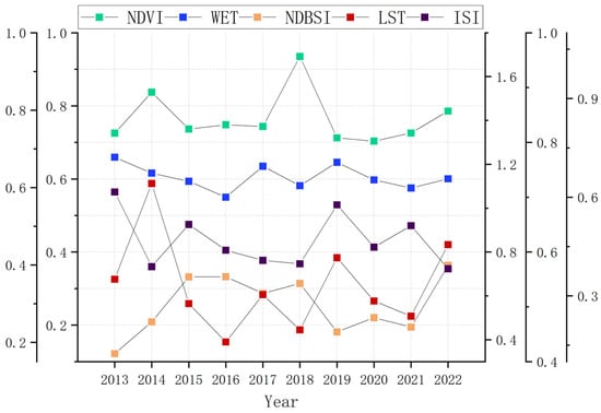 To facilitate the presentation of the results, the dimensions were standardized, and the results of the five component indices of the Tenihe Farm IRSEI are displayed using normalized outcomes. The results of component indices spanning from 2013 to 2022 are presented as follows.