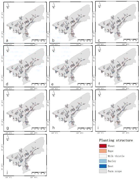 Crop types and spatial distribution of crops grown on Tenihe Farm over a ten-year period: (a–j) correspond to the results from 2013 to 2022, respectively.