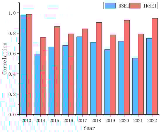 As can be inferred from Figure 14, over the decade from 2013 to 2022, the IRSEI exhibited a greater correlation with crop yields. Therefore, it can be deduced that the IRSEI method offers a higher degree of accuracy in evaluating the ecological quality of farms.