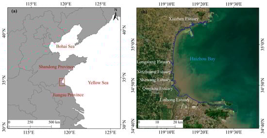 The study area was located at the border between Jiangsu Province and Shandong Province, an open bay on the western side of the South Yellow Sea (Figure 1). The coastline of the study area is about 170 km long and covered an area of 876.3 km2 [25]. Jiangsu Province is the province with the widest distribution of tidal flats in China, and Haizhou Bay is a typical representative of the tidal flats in northern Jiangsu Province, where a high tidal range of up to 4 m makes the distribution of tidal flats in this region more extensive. There are six major estuaries in the study area, and these estuaries are the main source of sediment in Haizhou Bay. The Haizhou Bay area is mainly a sandy, silty and bedrock harbour coast, which provides a suitable habitat for birds and has become an important migratory stopover in the East Asia–Australia migration corridor [26]. Under the influence of sea farming and harbour construction activities, the shoreline morphology of Haizhou Bay has changed considerably, which has a great impact on the tidal flats and siltation of the beaches in the area. It is a natural place for studying the impact of human activities on the evolution of tidal flats and siltation of the beaches.