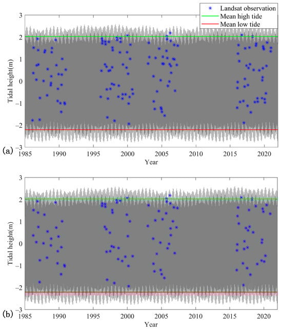 We used tidal heights from the TPXO9 model to determine the tidal height at the time each Landsat image was acquired. TPXO is a globalised ocean tidal model that has been developed by Oregon State University and is best suited to the Laplace Tidal Equations and altimetry data in a least squares sense (www.tpxo.net, accessed on 13 August 2023). The TPXO model consists of eight primaries (M2, S2, N2, K2. K1, O1, P1, Q1, and two long-period (Mf, Mm) and three non-linear (M4, MS4, MN4) harmonic constituents of the complex amplitude [27]. TPXO9-atlas is the latest 1/30-degree resolution global solution for all coastal regions, including the Arctic and Antarctic. The number of remote sensing images obtained was acquired with the temporal distribution shown in Figure 2 to determine whether the Landsat images covered different tidal heights. In the figure, the green and blue lines represent the mean high tide and mean low tide, and we can observe that the remotely sensed images are basically between the mean high tide level and the mean low tide level, and most of the images reach the mean high tide level, while the number of images that reach the mean low tide level is less. Due to the periodicity of the tidal process, the observed tidal heights were not evenly distributed over the intertidal zone. The numbers of usable remote sensing images obtained for each period were 33, 44, 34, and 42, respectively (Figure 2a).