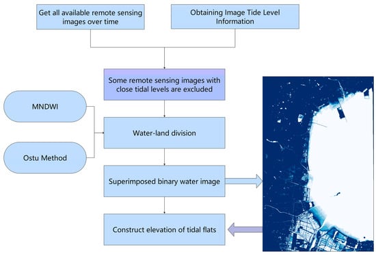 As shown in Figure 3, to construct the tidal flats based on the inundation frequency method in this study, it is necessary to acquire a sufficient number of images, then delete the images with close tide levels, and finally construct the topographic elevation of the flats by superimposing the binarised images.