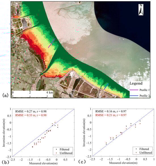 Profile location and accuracy verification results: (a) shows the topography of the southern part of Haijhou Bay from 2016 to 2020, and the purple and blue lines are accuracy-verified profiles. (b,c) show the results of the accuracy verification, black and red colours indicate the validation results for images filtered and unfiltered, respectively.