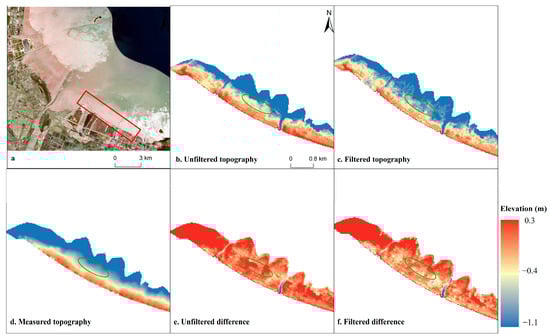 Comparison of the results of the optimised inundation frequency method: (a) shows a satellite image of the south side of the study area, with a red box showing the comparison area. The green boxes in (b–d) show the areas where the optimisation is more pronounced. (e,f) show the difference between the unfiltered and measured terrain and the filtered difference, respectively.