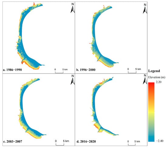 Digital elevation models for four time periods in Haizhou Bay: (a–d) show the topography constructed from 1986 to 1990, 1996 to 2000, 2003 to 2007 and 2016 to 2020, respectively.