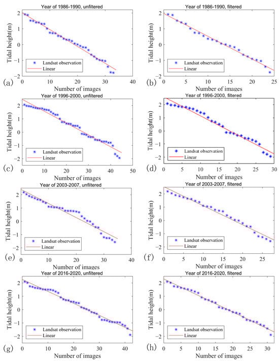 As shown in Figure 7a,c,e,g show the distribution information of the tidal heights of the images before screening, and Figure 7b,d,f,h show the distribution of the tidal heights after screening. The tide level distribution characteristics of the available images at the four time points are different, but all of them exist at certain tide heights. There are multiple remote sensing images with relatively close elevations, which affects the true inundation frequency of the images, and undoubtedly weakens the advantages of the formulae applied in the inundation frequency method. After screening remote sensing images with intervals less than 1/n m, it can be seen that the distribution of the tide levels is more uniform, which is conducive to the inversion of beach topography using the linear formula.
