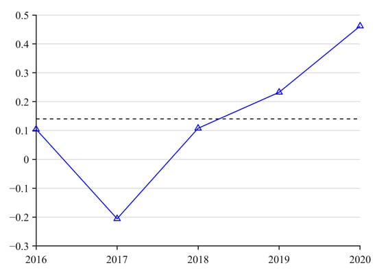 In order to assess the change in the beach tidal flats in Haizhou Bay over five years, we selected remote sensing imagery available for each of the years 2016–2020 to construct the topography of the beach tidal flats for each year. Profile 1 was selected to assess the inter-annual change in the beach tidal flats, using the inverted elevation at Section 1 for each year minus the measured elevation of profile 1 in 2016, and the mean value of the interpolated values for each year was calculated, and the results are shown in Figure 8. Without considering the effect of the insufficient number of remote sensing images on the accuracy of the results, it can be seen that the results for 2016 were closest to the measured one, while the results for 2020 had the largest difference. The black dashed line in the figure shows the average elevation change between five years, and its mean value is 0.14 m, indicating that the topography did not change much during the five years, which also shows that the average beach and tidal flat topography constructed from five years of remotely sensed imagery can roughly reflect the actual situation of the tidal flats. The topography of tidal flats is highly variable due to human reclamation projects, which often cause the topography of tidal flats to increase and siltation to occur around them. The topography constructed using the inundation frequency method is the average of five years, which will make the results of the topography of the reclaimed area low. Therefore, to meet the requirement of the number of remote sensing images, the inundation frequency method is not suitable for areas with large topographic changes.