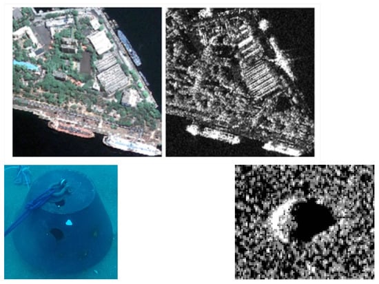 Optical and SAR images of the same structure, from [11] (top panels), and, for comparison, optical and SAS images of an underwater object (bottom panels). Similarities can be observed between the land images, whereas the marine-based images appear very different.