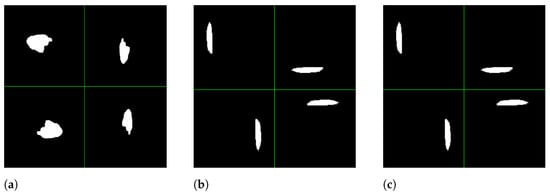 Augmentations performed in optical, SAS highlight and SAS shadow contour, in order to obtain the feature distributions. The contour in each figure belongs to the same object, a cylinder. Each figure above is a square grid with the original contour, and three rotations: 90, 180 and 270 degrees. (a) Contour of rotated optical images. (b) Contour of SAS-highlight images. (c) Contour of SAS-shadow images.