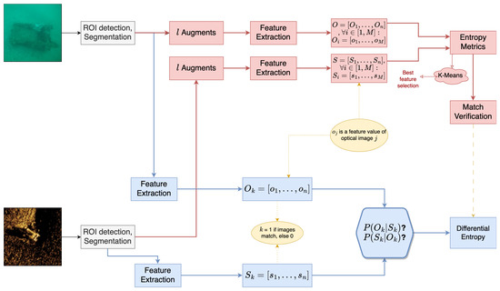 Our goal is to divide the original ROIs from SAS and optical images into positive (matched) and negative (mismatched). Formally, given an ROI from an SAS image S, and an ROI from an optical image O, we determine whether , or whether . The former states that O provides valuable information about S, while the latter states that S is related to O. In both cases, the conclusion is that S and O contain the same object. This is explored via the information exploration route (blue lines), where we define feature vectors in terms of matching and non-matching optical and SAS data points, which we directly compare via an entropy measure and their conditional and marginal probabilities.