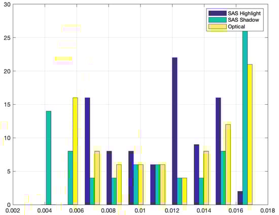 The entropy-based matching method is based on the distribution function of the features extracted from the SAS ROI and the optical ROI. Depending on the direction of exploration, from SAS to optical or vice versa, the two distributions are computed and labeled as and . These are then fed into one of the entropy measures listed in Section 2.2.2, the result of which is called a soft decision. Crossing a threshold for this value would result in a positive or negative decision for each pair of SAS and optical ROIs. This process is applied separately for the shadow and highlights segments of the SAS ROIs and separately for the SAS to optical and optical to SAS directions. A positive match is determined if one of these tests leads to a positive decision. In the following sections, we provide details on how to obtain the distribution of the individual features.