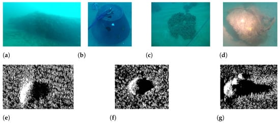 Examples of images from each type of object in the dataset. (a) Optical image of cylinder. (b) Optical image of manta mine. (c) Optical image of natural object. (d) Optical image of box. (e) SAS image of cylinder. (f) SAS image of manta mine. (g) SAS image of natural object.